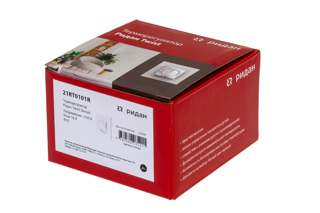 21RT0101R — Ридан Twist терморегулятор белый IP 21, размеры 84 x 84 x 53 мм, диапазон регулирования температуры 5...42 °С