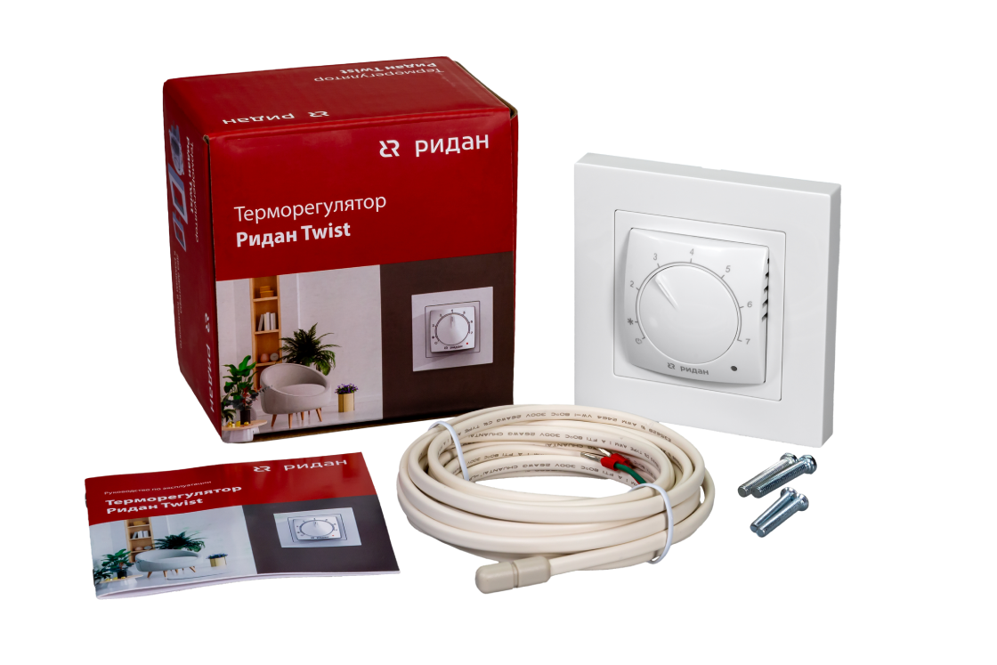 Ридан Twist — электронный терморегулятор, предназначенный для управления системой «теплый пол». Выполнен в минималистичном дизайне, эргономичен, прост и удобен в управлении. В комплект входит датчик температуры пола на проводе.