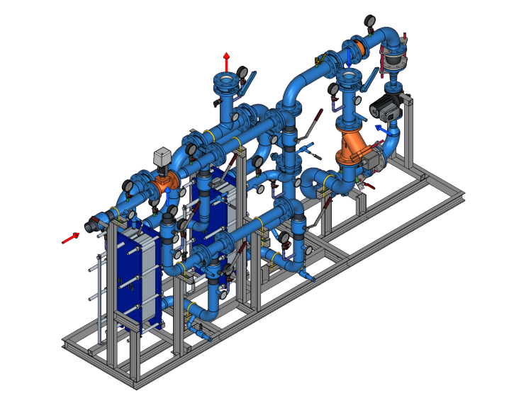 Узлы управления системами отопления и вентиляции однотипные. Они могут выполняться как в виде насосных смесительных узлов при зависимом присоединении систем к тепловой сети, так и с теплообменником — при независимом присоединении. Независимые системы отопления (вентиляции) могут быть как с одним теплообменником (БТП-HS), так и с резервом теплообменников 50, 75 или 100% (БТП-HSR).