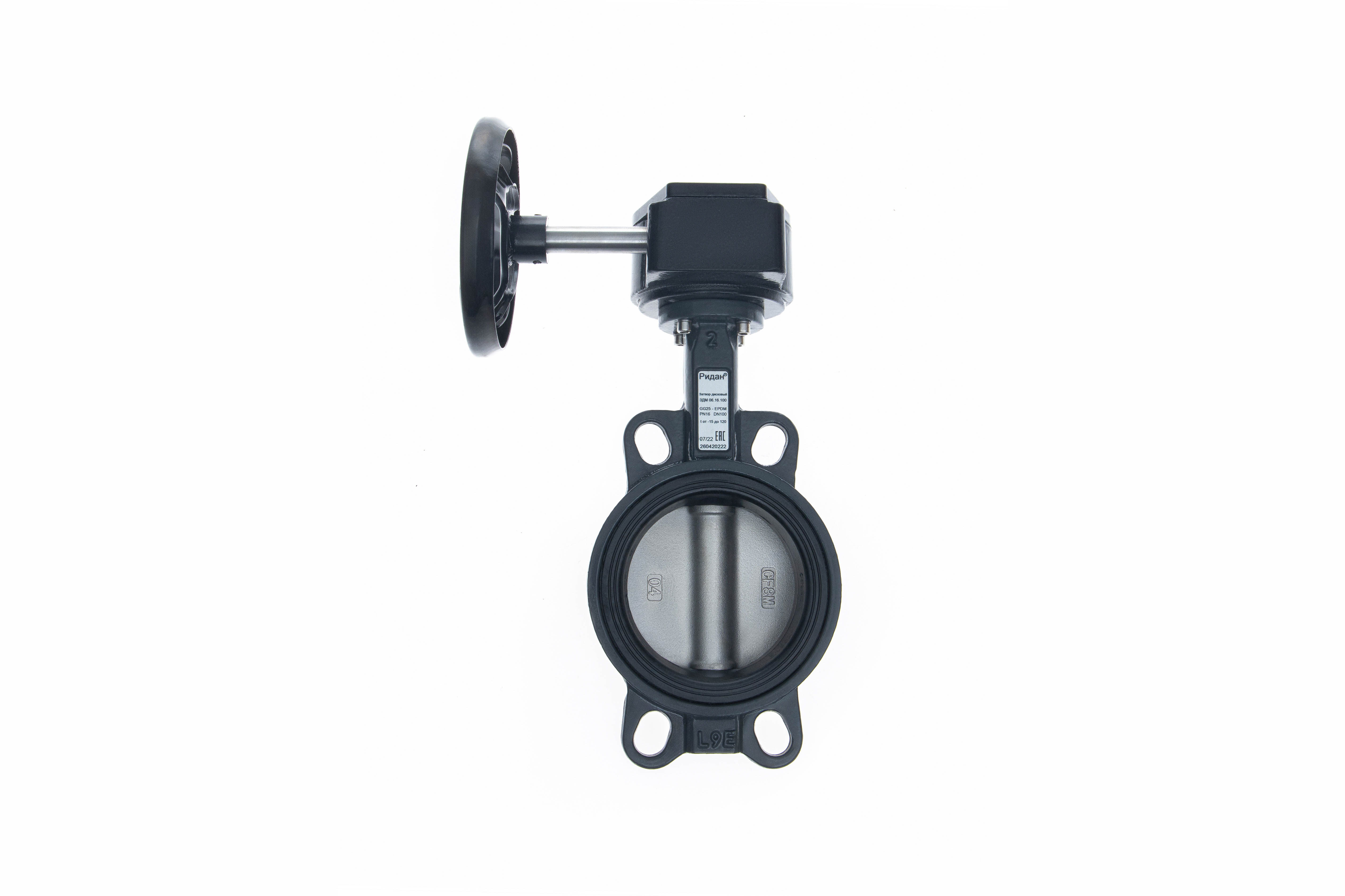 Ридан 082X4432R — Затвор дисковый поворотный ЗДМ 06.16.150, PN16, DN150, корпус GG25, диск — нержавеющая сталь AISI316, уплотнение EPDM, с ручным редукторным приводом